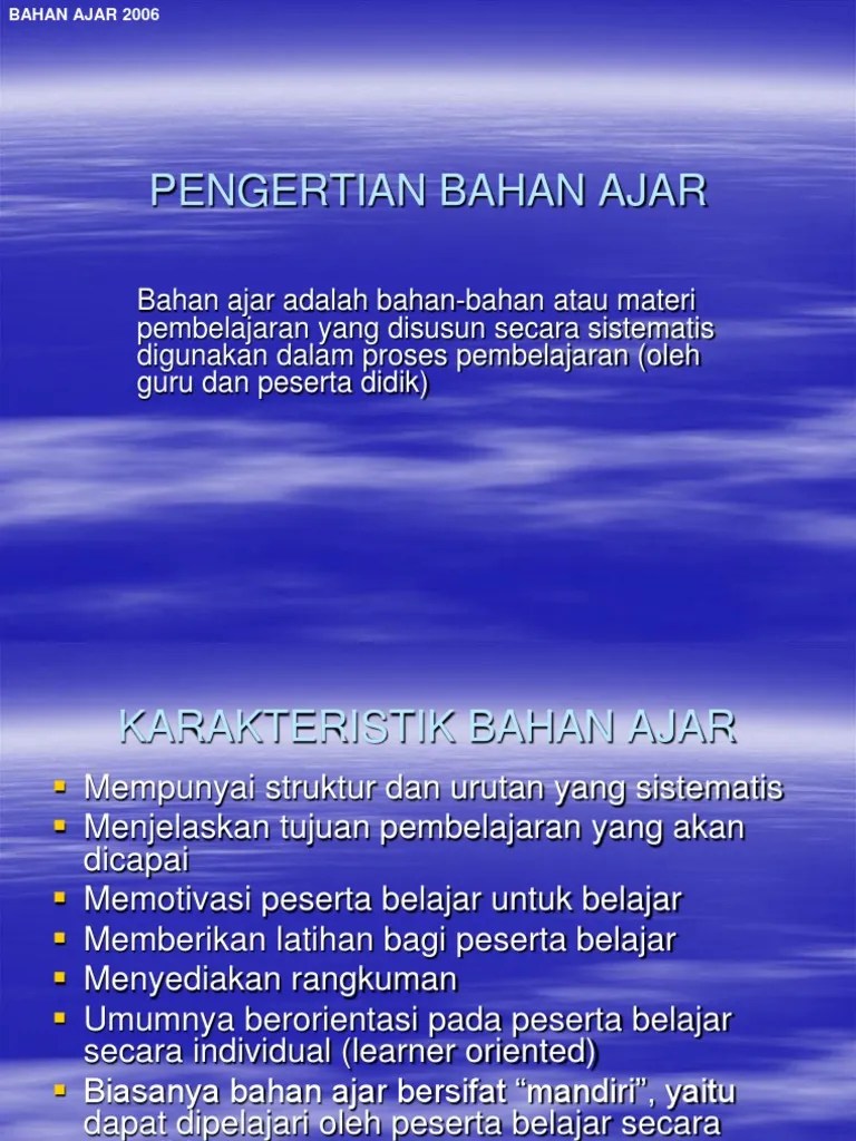 Bahan Ajar Yaitu : Kriteria Penilaian Bahan Ajar Pdf - Menurut national centre for competency based training (2007), bahan ajar adalah segala bentuk bahan yang digunakan untuk membantu guru atau .. Menurut national centre for competency based training (2007), bahan ajar adalah segala bentuk bahan yang digunakan untuk membantu guru atau . Bahan ajar atau learning material, merupakan materi ajar yang dikemas sebagai bahan untuk disajikan dalam proses pembelajaran. Materi ajar adalah segala bentuk materi yang digunakan untuk membantu guru/instruktor dalam melaksanakan kegiatan belajar mengajar. Bahan ajar adalah segala bahan (baik informasi, alat, maupun teks) yang disusun secara sistematis, yang menampilkan sosok utuh dari kompetensi yang akan . Bahan ajar merupakan sumber belajar berupa visual maupun audiovisual yang dapat digunakan sebagai saluran alternatif pada komunikasi di dalam .